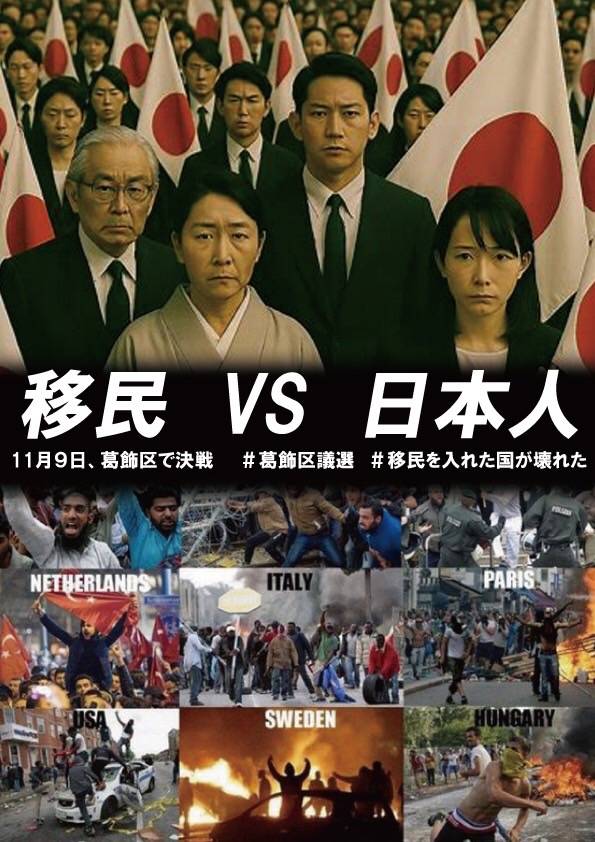 「いま妖怪がヨーロッパを徘徊している。共産守護という妖怪が」(共産党宣言 ) 不法移民すなわち不法滞在外国人、これでもって既に犯罪である。彼らがある一定の数を形成すれば、国家も手出しできない単なる集団ではなく犯罪集団となる。集団の言語を主体としたコミュニティが形成され、自らの文化を持ち込む自治区が成立する。しかもまともな生業に定着できないゆえ、当然として麻薬、売春、違法取引などなど治安を根底から脅かす生活形態を選択せざるを得ない。治安を脅かすどころか破壊しているのが、いまヨーロッパを徘徊している移民といって良い。 政府が進める無策の移民政策がこのままであれば、早晩遅かれ早かれ、移民問題で荒れるヨーロッパと同じ状況になるのは間違いないであろう。 葛飾区から狼煙をあげよう。違法民泊と不法滞在外国人の根絶を!「異文化共生」から葛飾区の安全と安心を、健全な住居環境を守ろう!